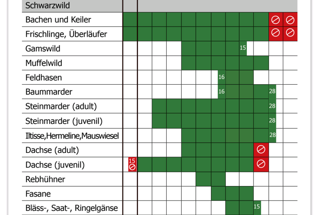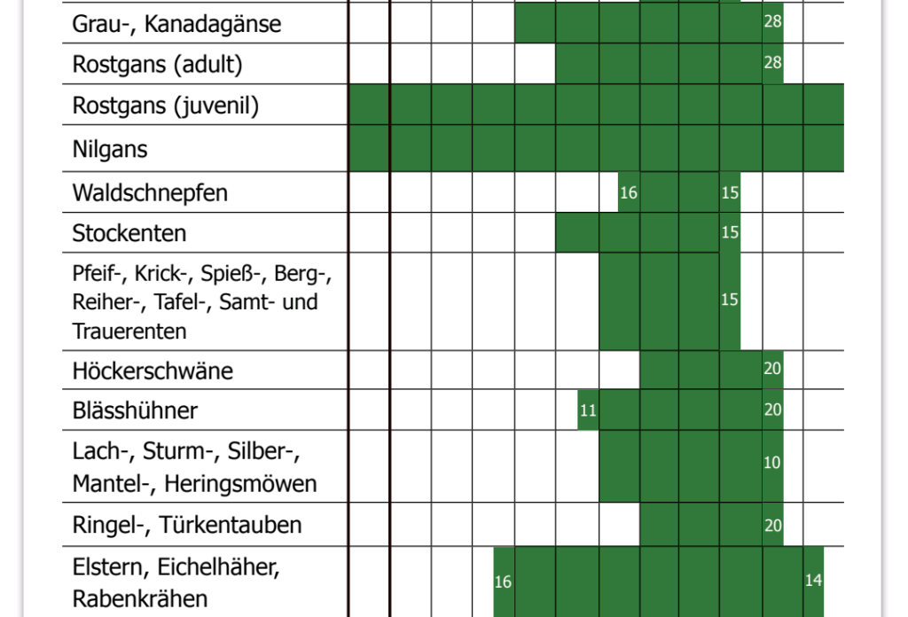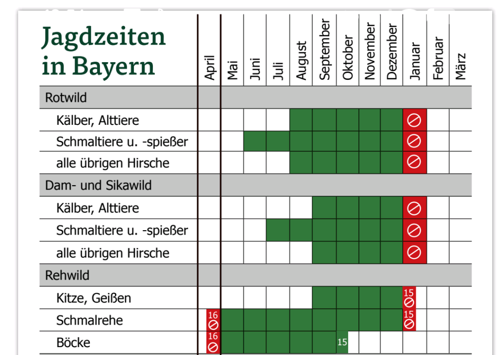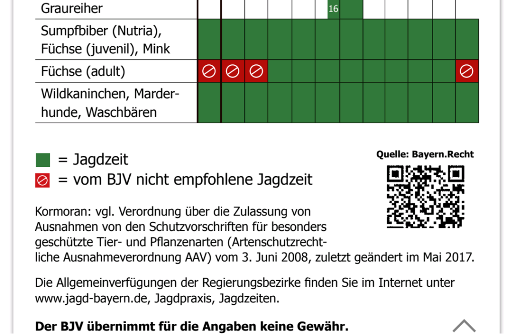 - BJV-Empfehlungen: Wir haben eigene, fachlich fundierte Jagdzeit-Empfehlungen erarbeitet, die bewusst von den gesetzlichen Daten abweichen. Diese findet Ihr ab der kommenden Ausgabe in der „JAGD in Bayern“.